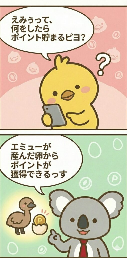 エミューを育成 → 卵を産む → 卵からポイント