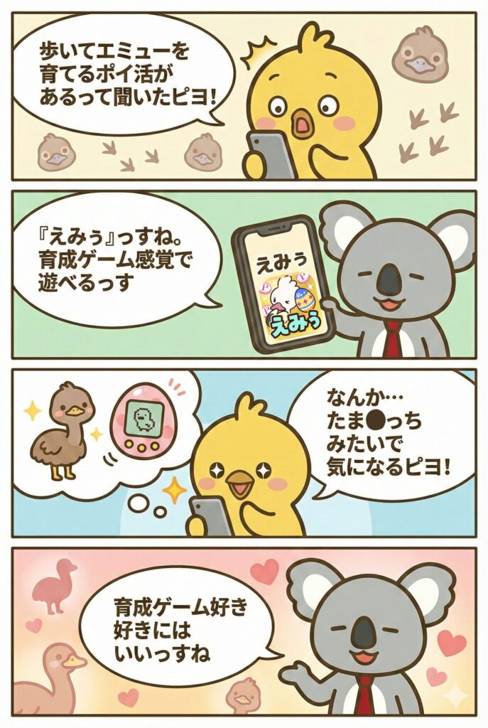 ポイ吉ラボ太~!歩いてエミューを育てるポイ活アプリがあるって聞いたピヨ!