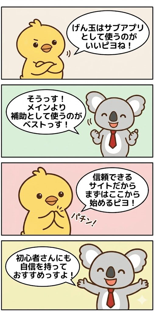 - 毎日のコツコツ作業だけでは少額になりやすく、サブ利用が向いている