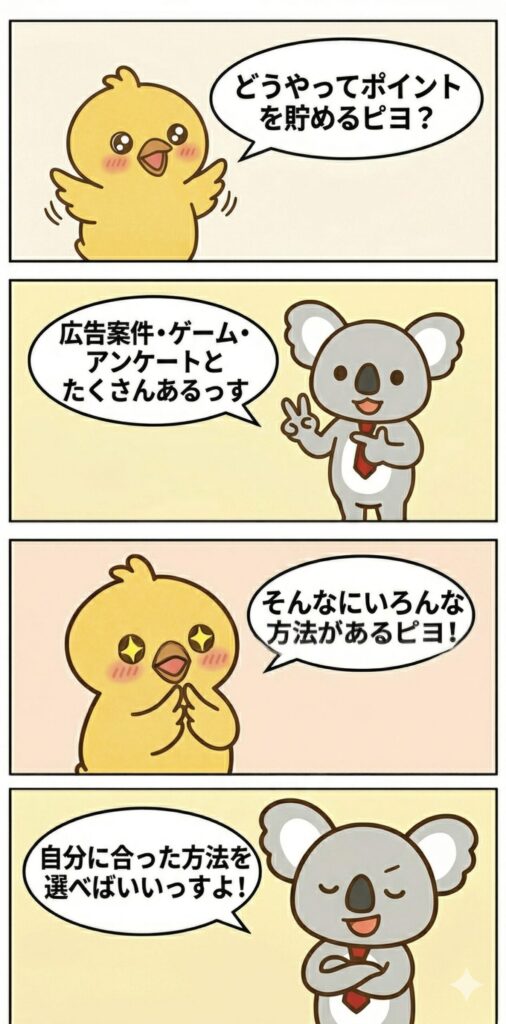 広告案件・ショッピング還元・ゲーム・アンケートなど、ポイントを貯める方法が豊富です。