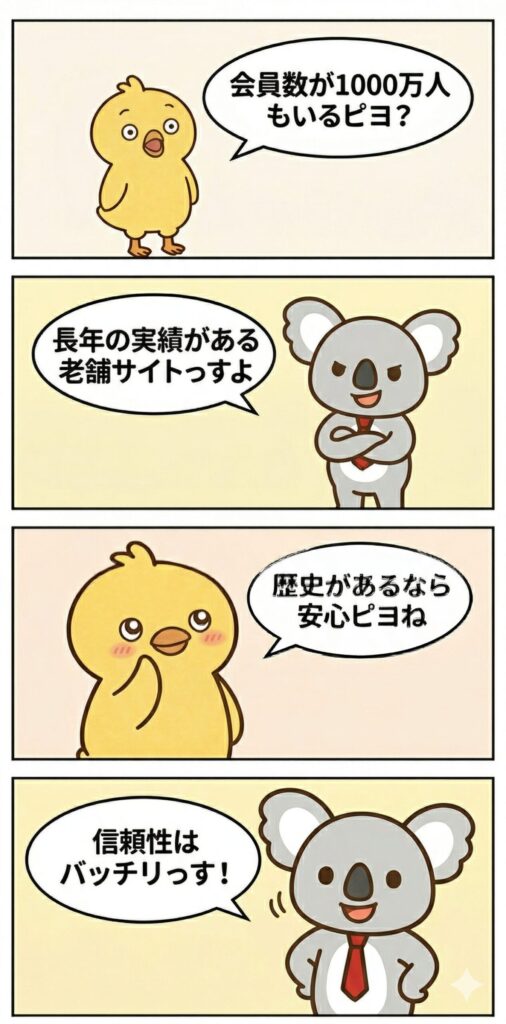 20年以上の運営実績があり、姉妹サイトを含む会員数は1,000万人を超えています。