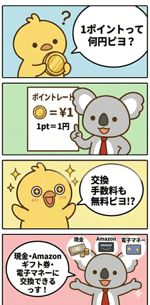- 1pt=1円・手数料無料・保証制度ありで安心感が高い