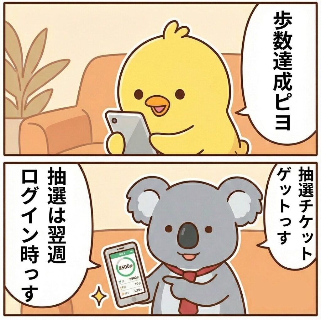 - ポイントに換えるには翌週に抽選ボタンを押す必要あり