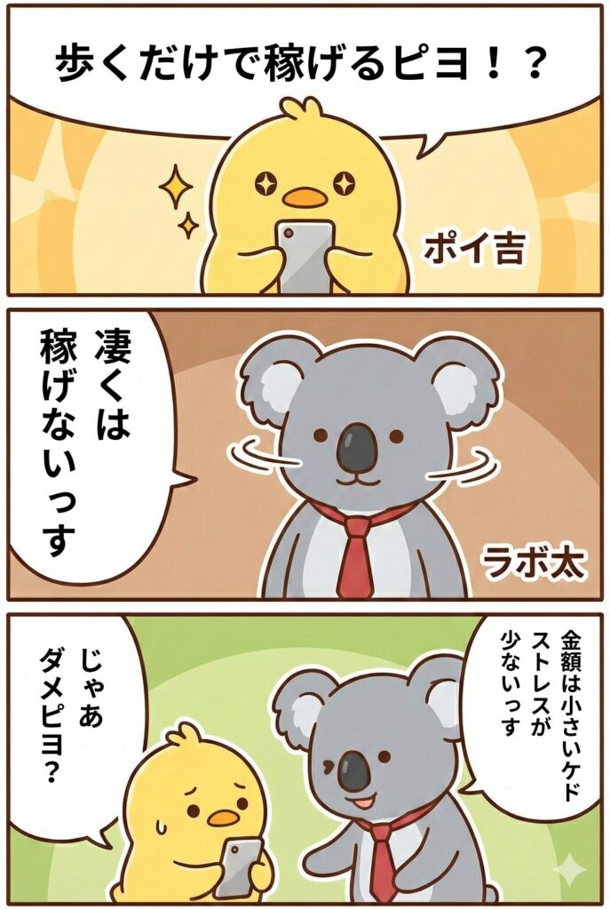 ポイ吉ラボ太~!郵便局の「かんぽアプリ」って歩くだけでポイント当たるって聞いたピヨ!