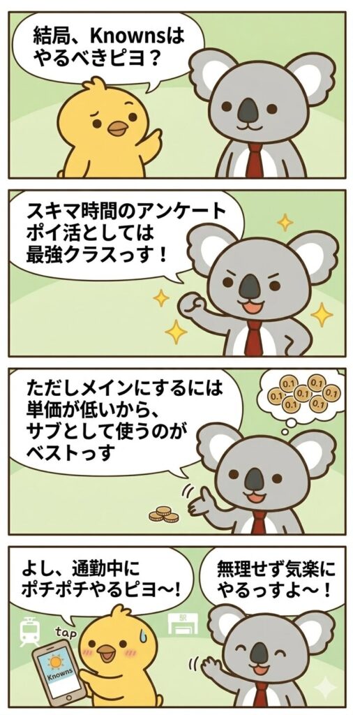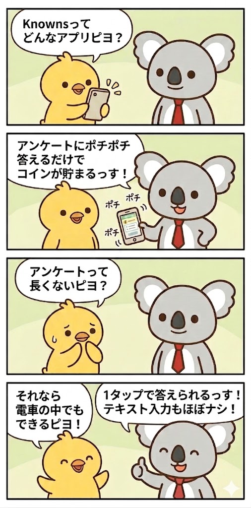 他のアンケートサイト(マクロミル等)と比べると単価はやや低めですが、タップ式で回答が超ラクなのがKnownsの強み。