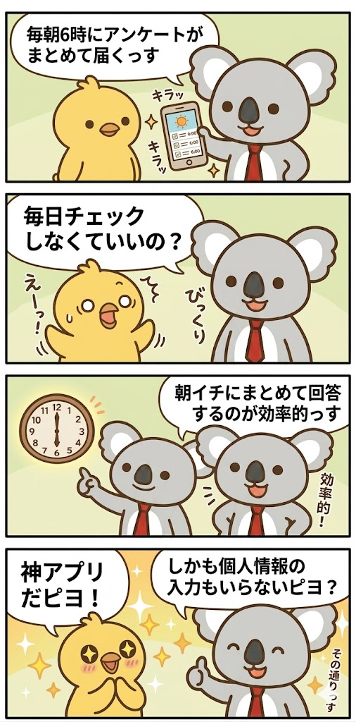 • 1タップ回答&毎朝まとめて配信で、ルーティン化しやすい