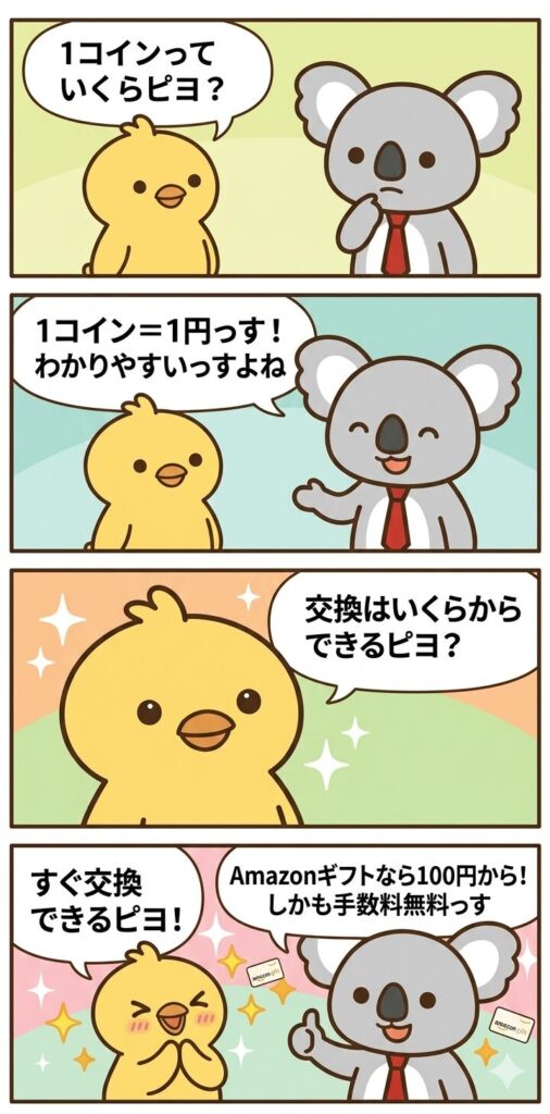 ハードルが低いのは助かるっすね。銀行振込で現金化もできるけど、手数料200コインかかるから注意っす