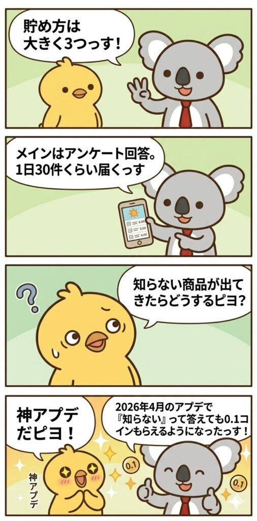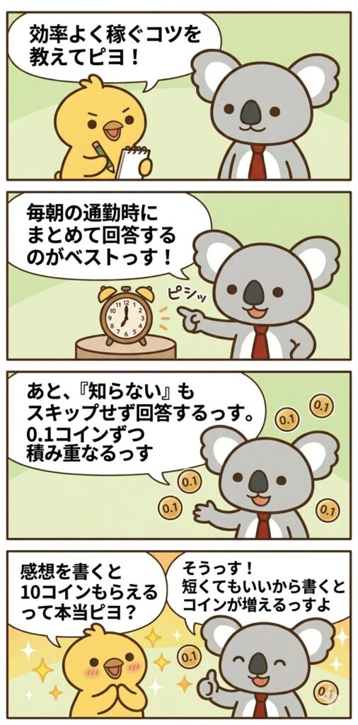 2026年4月のアップデートで、アンケートに「知らない」と回答しても0.1コインがもらえるようになりました。