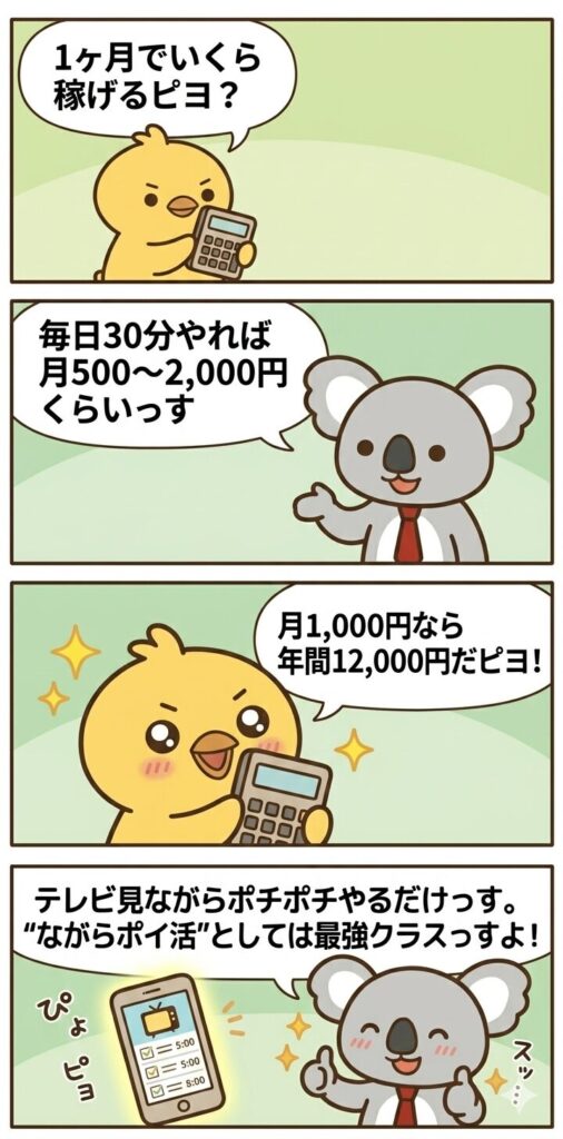 結論から言うと、月500~2,000円程度の収入が見込めます。1件あたりの単価は低めですが、アンケート配信数の多さとタップ式の手軽さでスキマ時間のポイ活として優秀です。