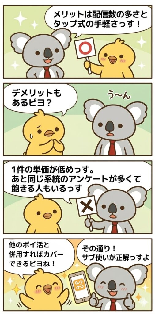 アンケートにサクサク答えるだけでコインが貯まるっす。1タップで回答できるから、スキマ時間のポイ活にはかなり優秀っすよ!