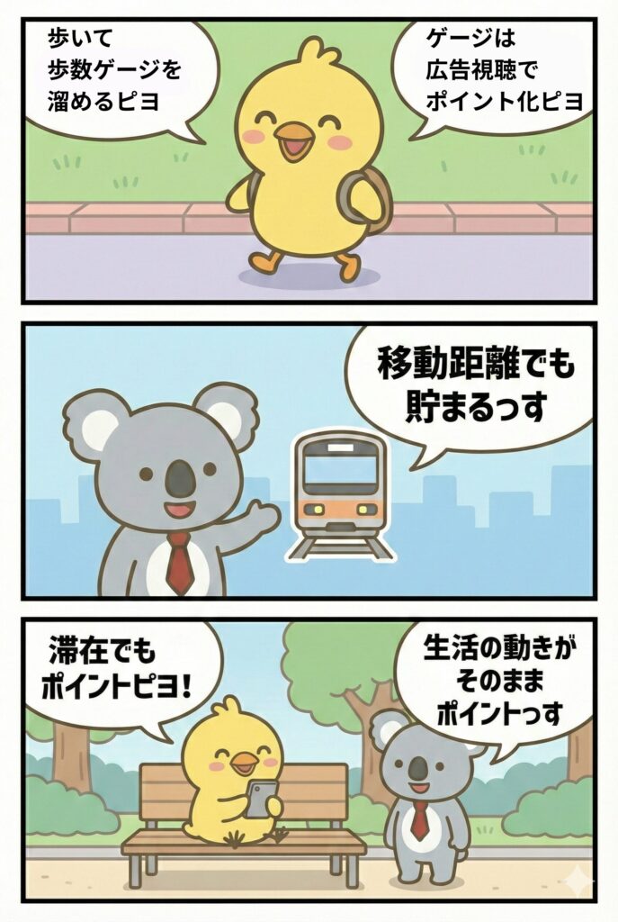 - 日常の移動・歩数・滞在・地域SNSの利用が、そのままポイントになる設計