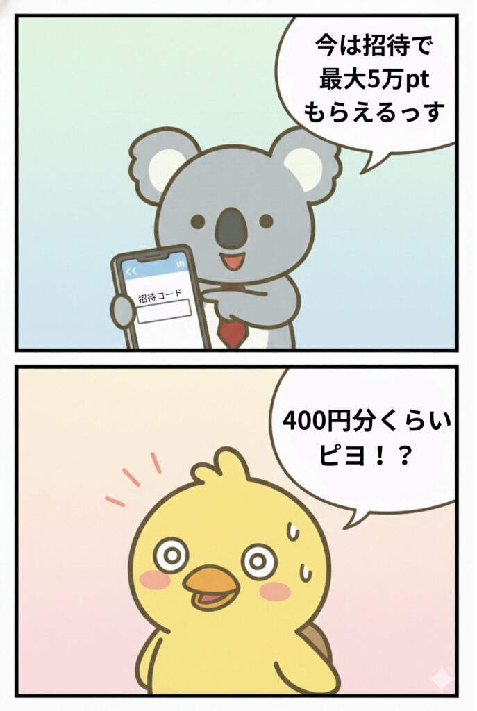- 新規登録者(招待コード利用側):最大50,000pt(約416円分)