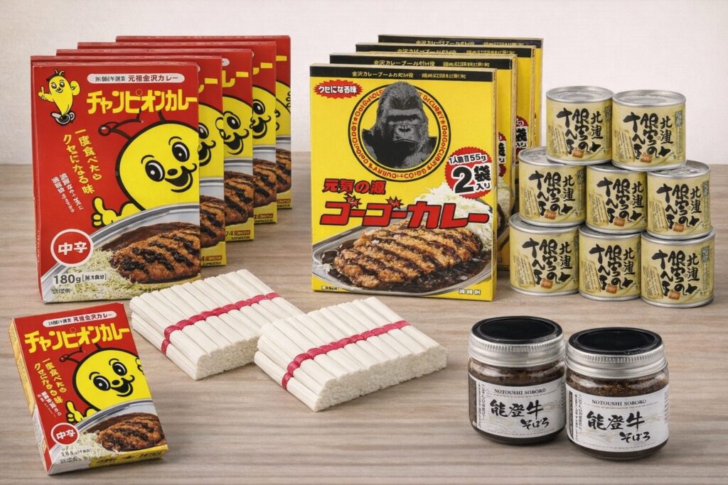 石川県産品カテゴリは能登半島地震からの復興支援の意味も含まれています。金沢チャンピオンカレー・ゴーゴーカレーなどの名物グルメは、クーポンを使いながら被災地を応援できる一石二鳥の選択です。