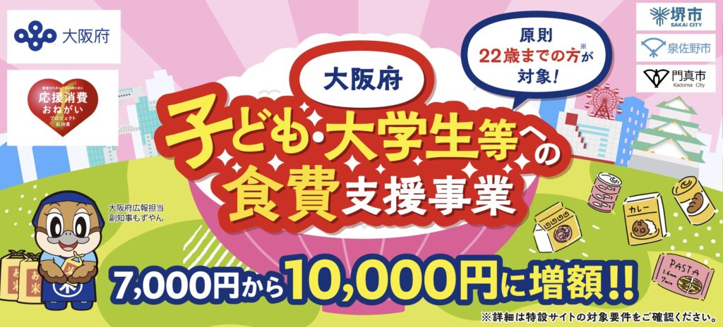 大阪府が行っている子育て世帯向けの支援策で、大阪府在住の子ども1人につき食費クーポン1万円分が支給されます。