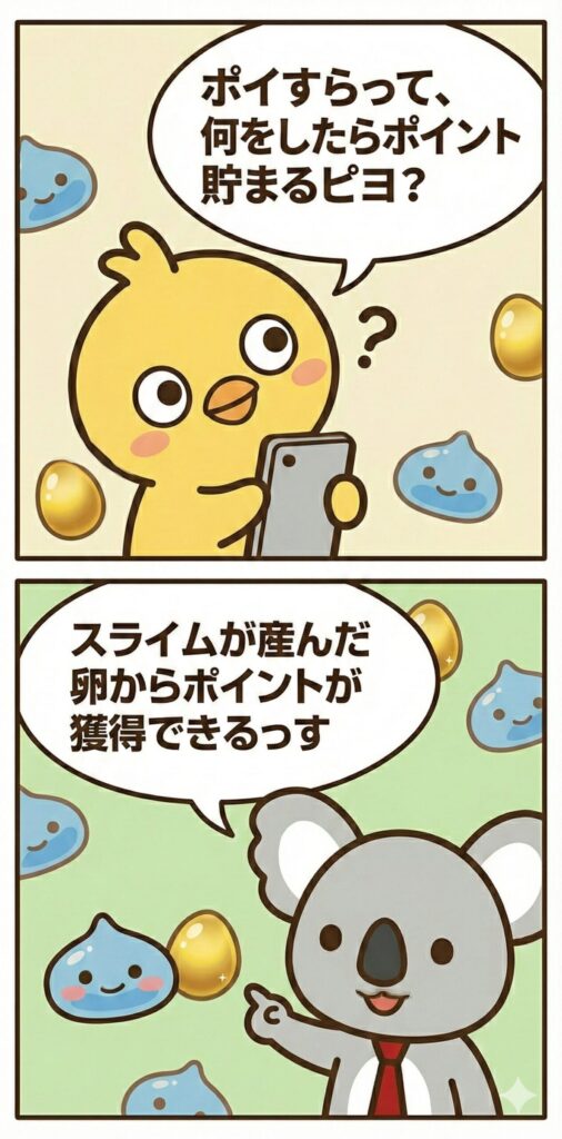 「ポイすら」は、歩数でスライムを育てて卵を産ませ、その卵からポイントがもらえる 育成ゲーム型ポイ活アプリ。