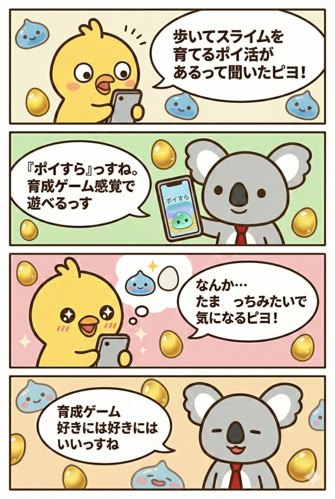 ポイ吉ラボ太~!歩いてスライムを育てるポイ活アプリがあるって聞いたピヨ!
