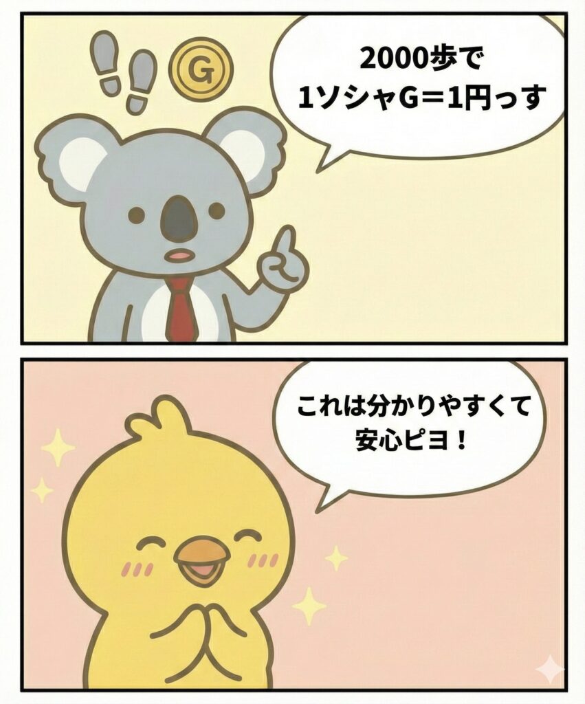 - 2000歩で1ソシャG(=1円)、1日1万歩で最大5円相当