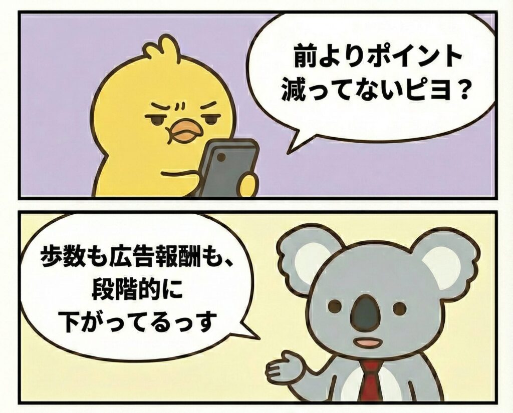 ただし、広告を大量に視聴すると「広告切れ」が発生し、歩数報酬を受け取れないトラブルも報告されています。