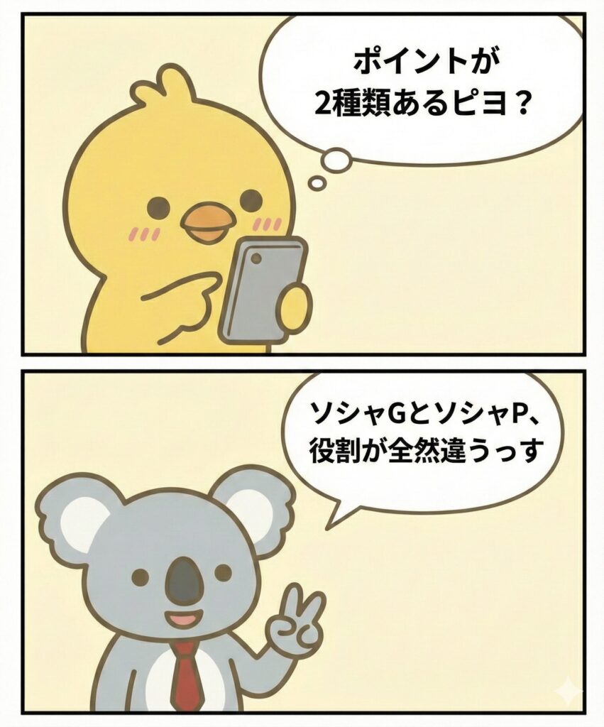 - 2種類のポイント(ソシャG/ソシャP)がある