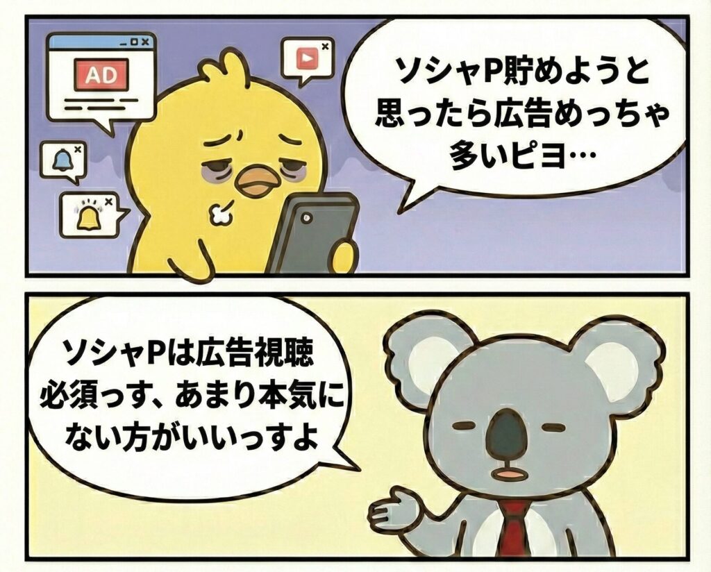 - 広告視聴のみで500億ソシャP貯めようと思うと1,000回以上広告を見る計算(ちょっと現実的ではないです…)