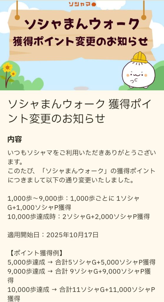 ソシャまんウォークで獲得できるソシャG(1ソシャG=1円)の獲得ポイント変更の発表がありました。