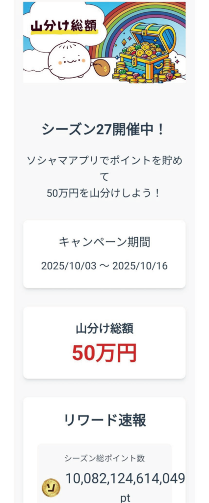 ポイント活アプリ「ソシャマ」の山分けポイントソシャPがシーズン27(2025.10.3~10.16)でどうだったのか徹底解説します。