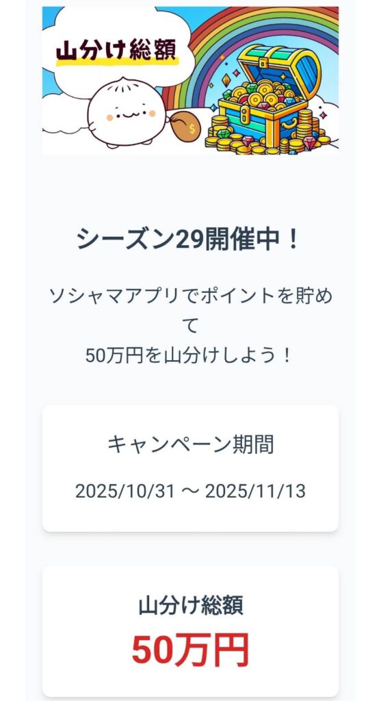 ポイント活アプリ「ソシャマ」の山分けポイントソシャPがシーズン29(2025.10.31~11.13)でどうだったのか徹底解説します。