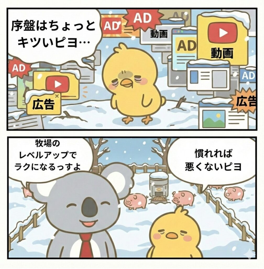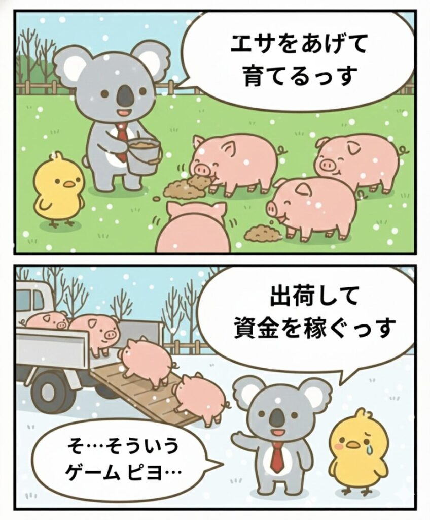 「出荷ぶた-冬 ver-」は、豚にエサを与えて育て、出荷して資金を稼ぎ、牧場をレベルアップする放置系ポイ活ゲームです。