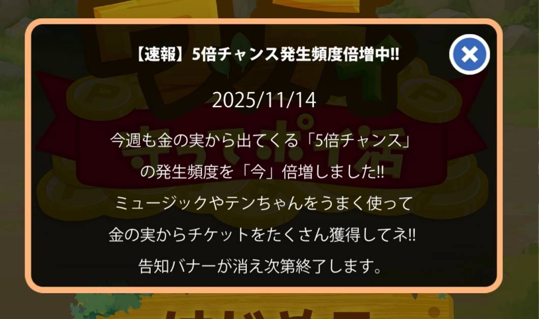 「金のチケット5倍チャンス」が金の実10個ごとに出る仕組みだったんですね!初めて知りました…情報ありがとうございます