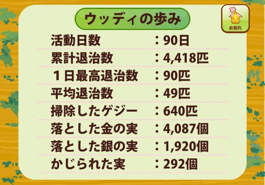 ちなみに「お別れボーナス」の正体は、金の実が10個でした…。