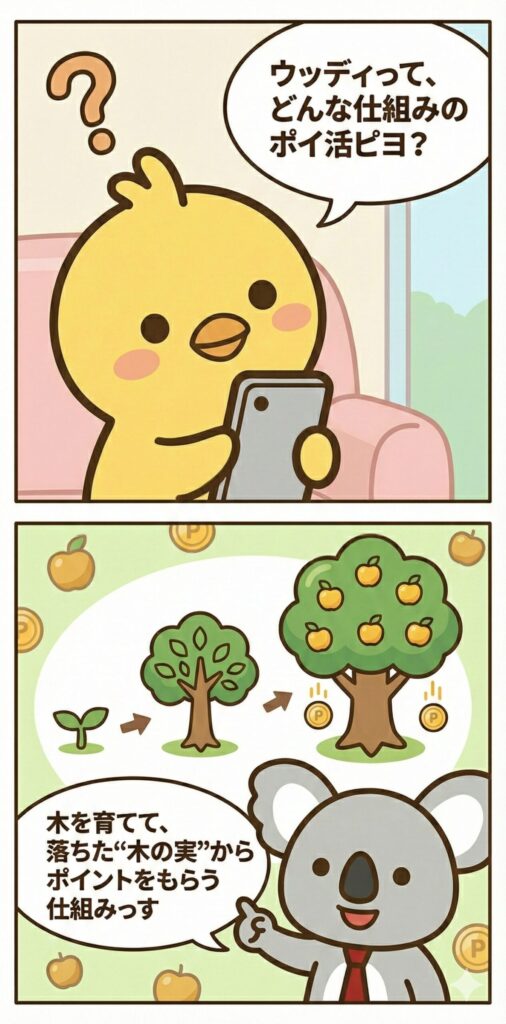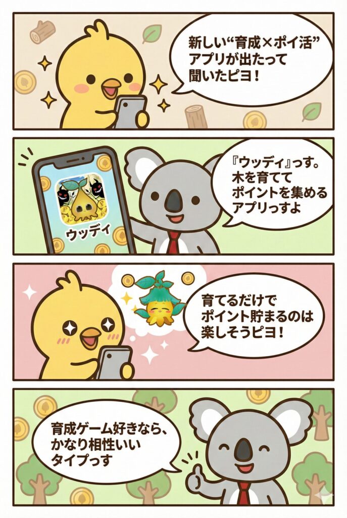 そうっすね!2025年8月末に登場した『ウッディ-守ってポイ活』っす。木を育てながらポイントを稼ぐ新感覚アプリっすよ!