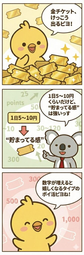 「ポイすら」や「えみぅ」経験者は「大量のチケットが貯まってお得」と感じますが「レートが違う」ので注意が必要です。